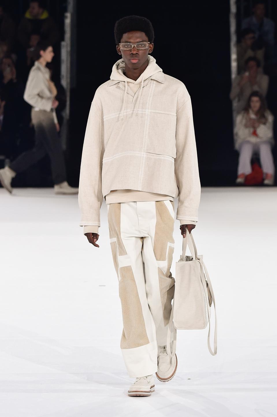 More recently, Simon showed off his Fall 2020 runway show in Paris, called L’ANNNÉE 97. Despite his previous collections being known for their color and uniqueness, this show was much more simplistic, modern, and located in La Defense Area which was surrounded in a grey, dark venue of contemporary architecture. This show also had no sets, or physical invites much like other designers in order to be more sustainable. His label also exhibited both of his collection instead of having four shows throughout the year which was also another positive towards sustainability in the environment and fashion industry. The clothes focused on linen materials, beige tones, ecru, silk, ivory, and sandy neutral colors.