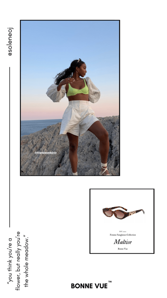 - B: Bonne Vue means good or beautiful views in French and through every lens, from wherever you are in the world, we’ll tell that story through our mood-boards. We are a virtual product of storytellers captured in motion and let’s not forget, “through the lenses of Bonne Vue”. We’ve been able to gather some of the most beautiful scenes with women all over the world. Some places include Greece, Sweden, Paris, London, California, and New York with all women wearing “Bonne Vue” sunnies. It truly is a movement that we cannot wait to grow.