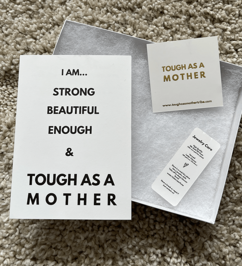 I don’t know about you but my favorite part about receiving a package is the packaging! The feeling you get when you open it to see the item you ordered is just the best feeling and I totally got that when I was opening this. Right on the front of the box in gold detailing and wording is the branding Tough As A Mother, and then there was a gold pouch as well to hold the jewelry.