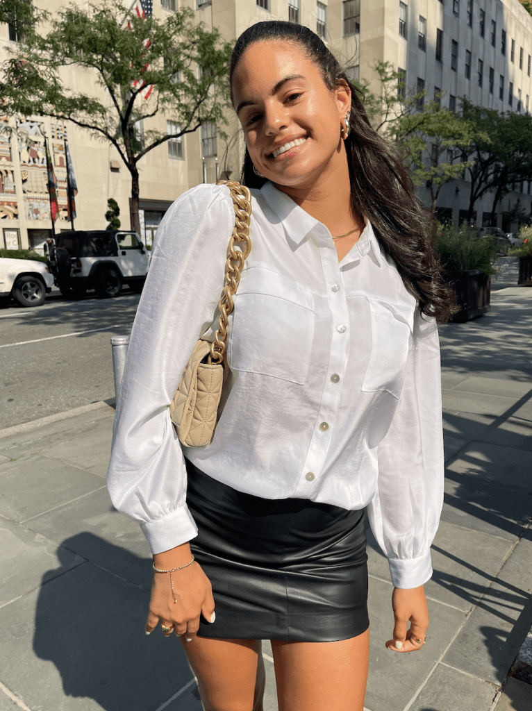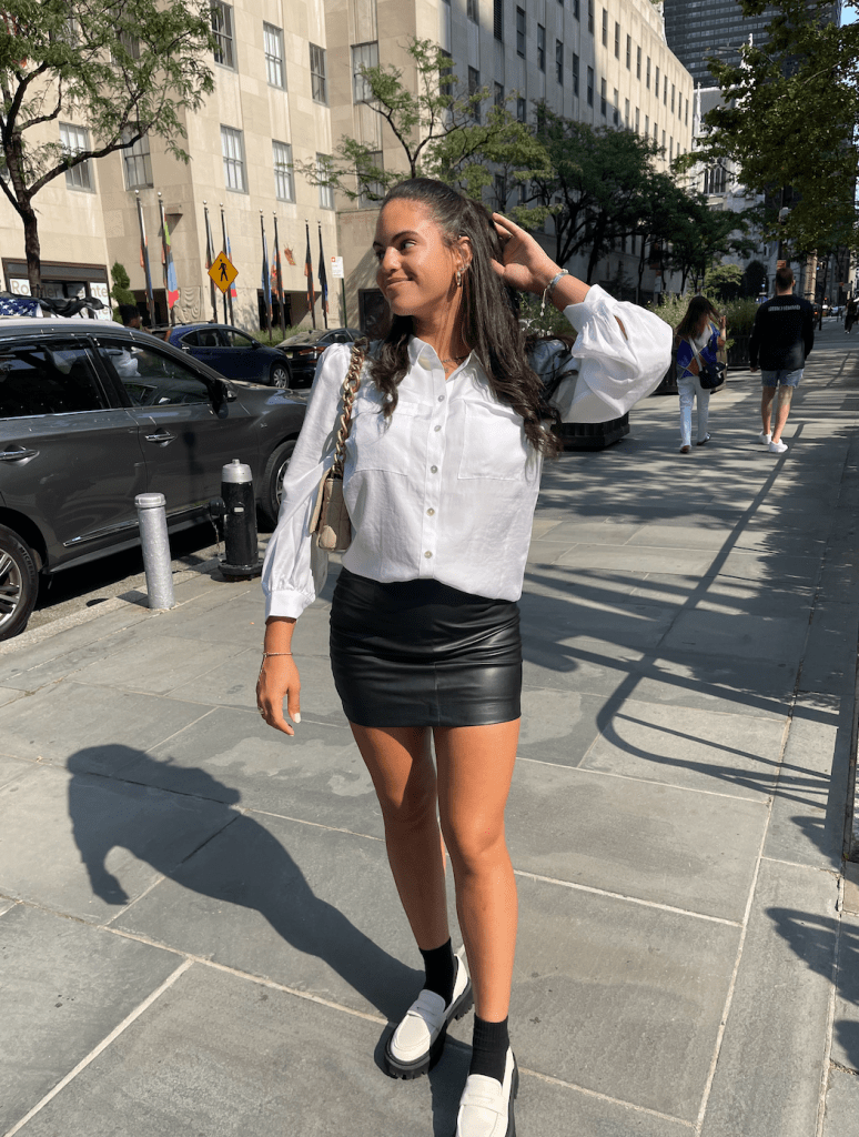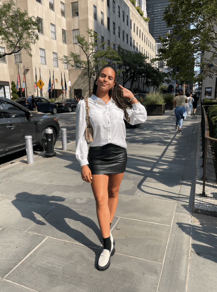 For my look, I chose to pick a pair of platform loafers and have that as the main statement of my outfit. Not only were they very comfortable fo walking around, but they are a great pair of basics that you need in your closet for the Fall. I paired it with a simple black leather skirt and white classic button up. To separate from the black and white look, I added a chunky gold beige bag and loved every piece of this look.