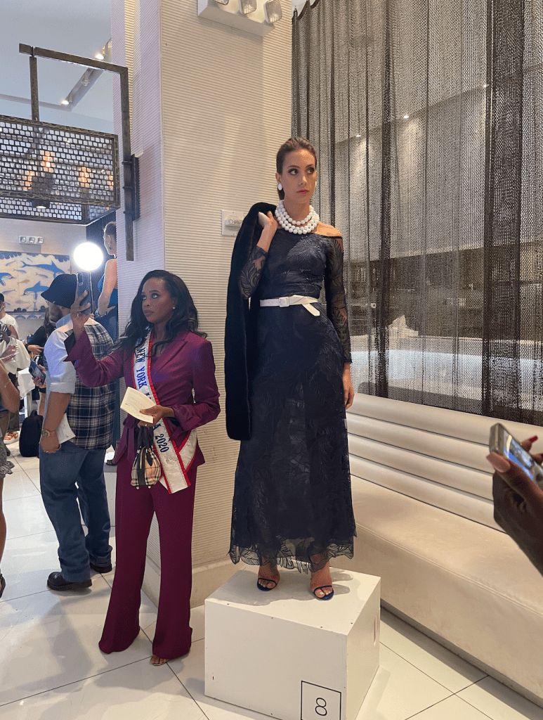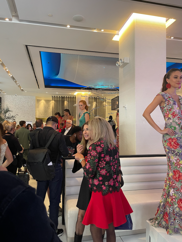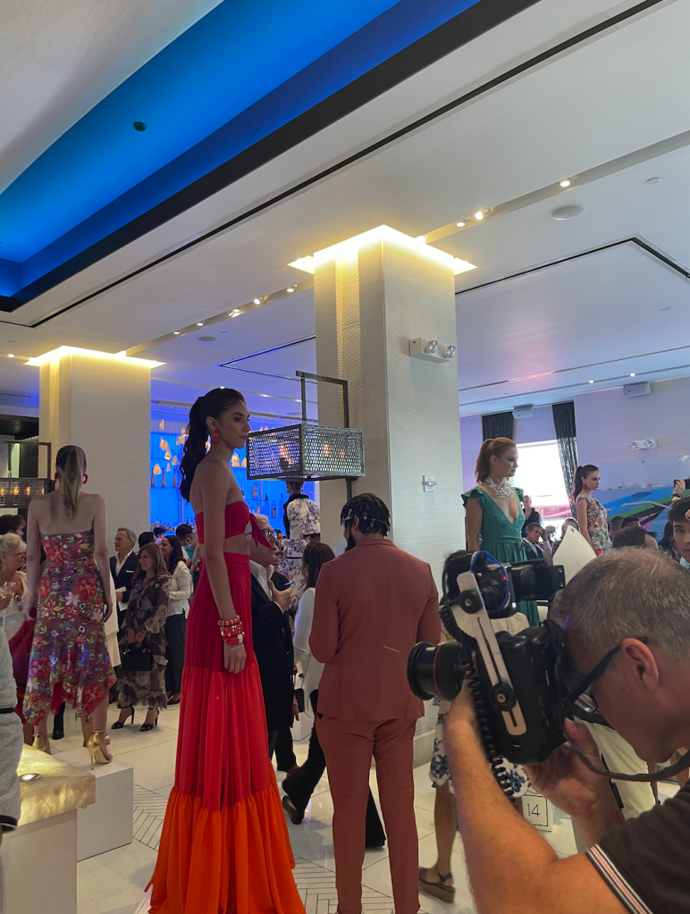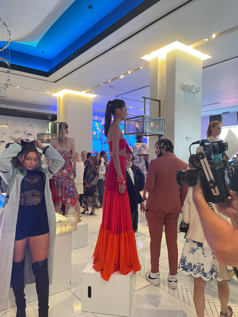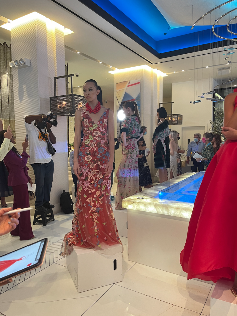 As you walk throughout the presentation, you will find flashes of photographers all around you as they are capturing the beauty of the dresses. There was a bar for complimentary drinks, pamphlets of the show being handed out giving credit to the team that put everything together, and some interviews being put together as well on the side.