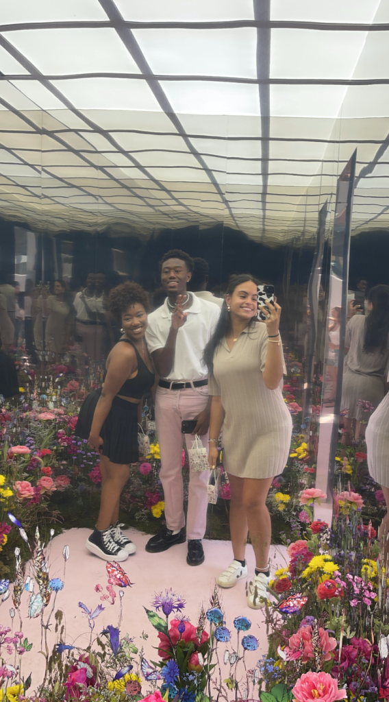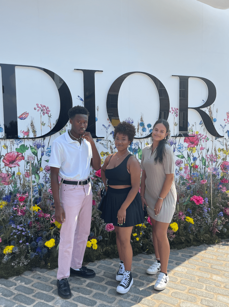 When we first arrived, it was a little bit of a line but I was surprised with how fast it moved! There was about a 20-25 minute wait which was perfect and everyone was extremely nice! While waiting and as you got closer, there was one person working for the pop-up that was holding a QR code which you could scan on your phone to make a reservation for the pop-up. I’m not entirely sure why we needed it since you didn’t have to scan it anywhere else, but I still made the reservation anyway and continued to wait closer to the front. There was also a wall that said Dior on it and it had a ton of beautiful and colorful flowers that made everything even more magical. Once you arrive to the front, there is another person who also works for Dior that does your photos for you and not only was he incredibly sweet, but he took a ton of photos for my friends and I which was great.