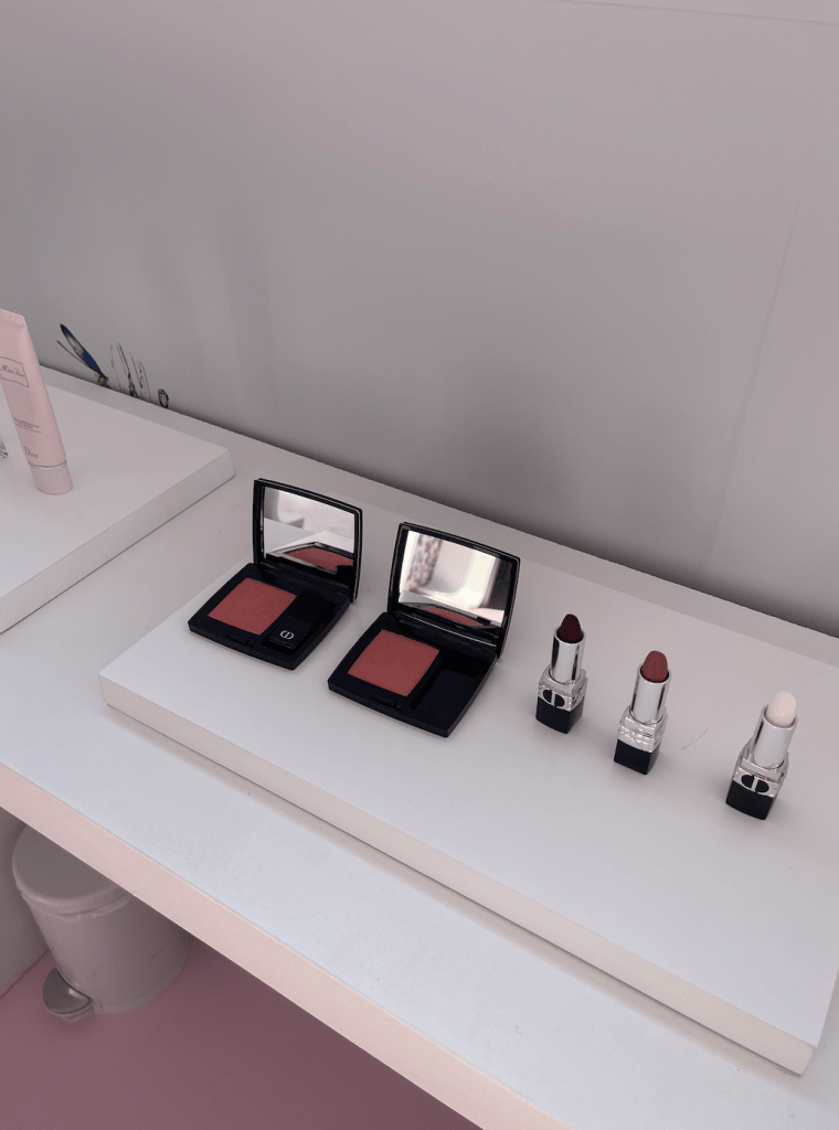 Entering the pop-up, we received a small bag of goodies and free samples including the Miss Dior perfume and a lipstick. The Miss Dior bag was also so cute because it had the flowers from the outside of the location on it too and it was so adorable! Once you walk through, you can immediately smell the Miss Dior perfume all throughout and there’s some people working there that offer to spray it on you. I got sprayed at least 3 times from 3 different people because it just smelled so good. Seriously. As you continue to walk around, there are little tables with the makeup on there, and some screens that show the perfume, commercials, and more. The tables were presented so nicely and everything was so pretty. There were also Dior books that were displayed on the tables and perfumes everywhere in different sizes. You can get your makeup done by those who providing services inside and if you spent $150 you were able to receive a tote bag as well with the Miss Dior print on it.