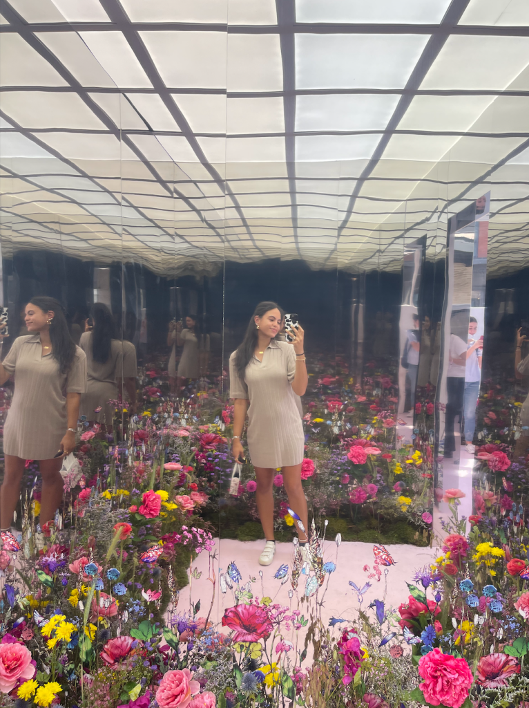 Of course the photos here were perfect and the day we chose to attend this pop-up couldn’t have been more perfect. The sun was shining and beating down on us which did get to us, but with the water and drinks provided for this service, there was nothing to complain about! The first photo-op was in the back which showed a beautiful flower design within a car done by Lewis Miller. It was just as beautiful in person and truly was the show-stopper of the entire event in my opinion! There was a photographer at this spot as well that was doing free photos for anyone at the car and then you could get it emailed to you at a small digital screen. More seating was available near the barista stand where you could sit at the pink chairs with the matching umbrellas that were so on brand and aesthetic. There was also a beautiful room with an infinity mirror and flowers all around that was perfect!