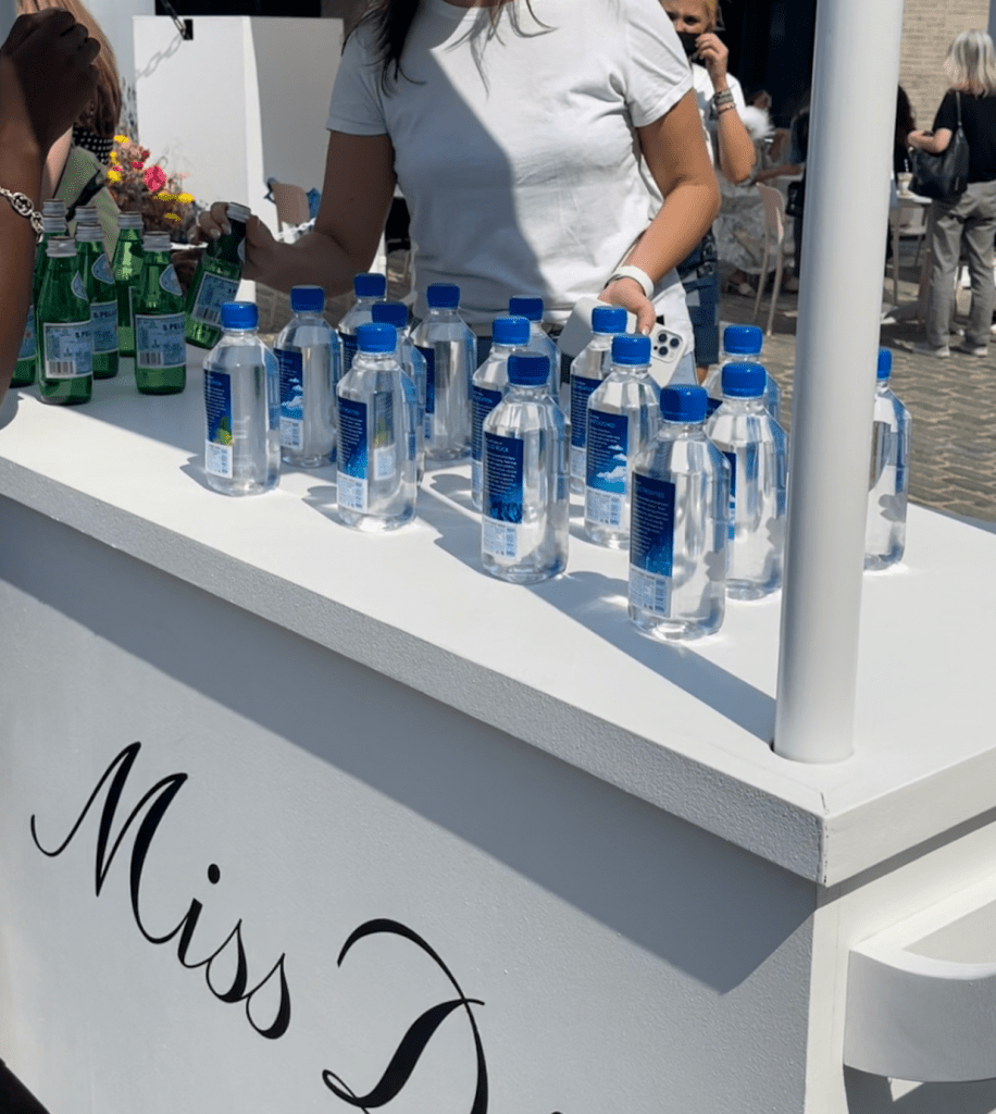As mentioned before ,there was a free goodies bag when you walked in with a sample size of the Dior perfume, a tiny lotion and a lipstick. The bag was absolutely precious and once you walked out of the Pop-up, there was also a back exit in which you can receive free drinks, photos, and sit at a table too. To the right of the exit, there was a small stand with an umbrella giving out sparkling water and regular water. Then, you can walk towards the back to wait in line for two baristas making drinks such as coffees, lattes, a beet drink, and more options. The drinks also came in a customized Miss Dior slip which was placed around the drink as shown below.