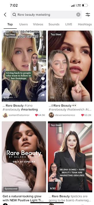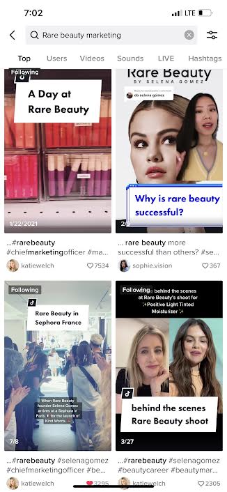 Something that also has stood out when it comes to Rare Beauty online is their transparency. The Rare Beauty Chief Marketing Office, Katie Welch gives not just career advice and marketing tips on her Tiktok page, but Rare Beauty fans can follow her for exclusive behind the scenes content. This content can include mini vlogs for what happens at Rare Beauty events, visiting Rare Beauty in Sephora’s around the world such as France, Days in the office and what it is like to work for the company and much more! Welch even has content about how to break into the beauty industry, staying on top of retail trends, sample CMO career paths, podcast recommendations, and even Tiktok lives where you can talk to her in real time and ask questions for her to answer! We don’t see many team members of celebrity beauty brands creating content like this and actually having a connection and bond with their audience, consumers and more.
