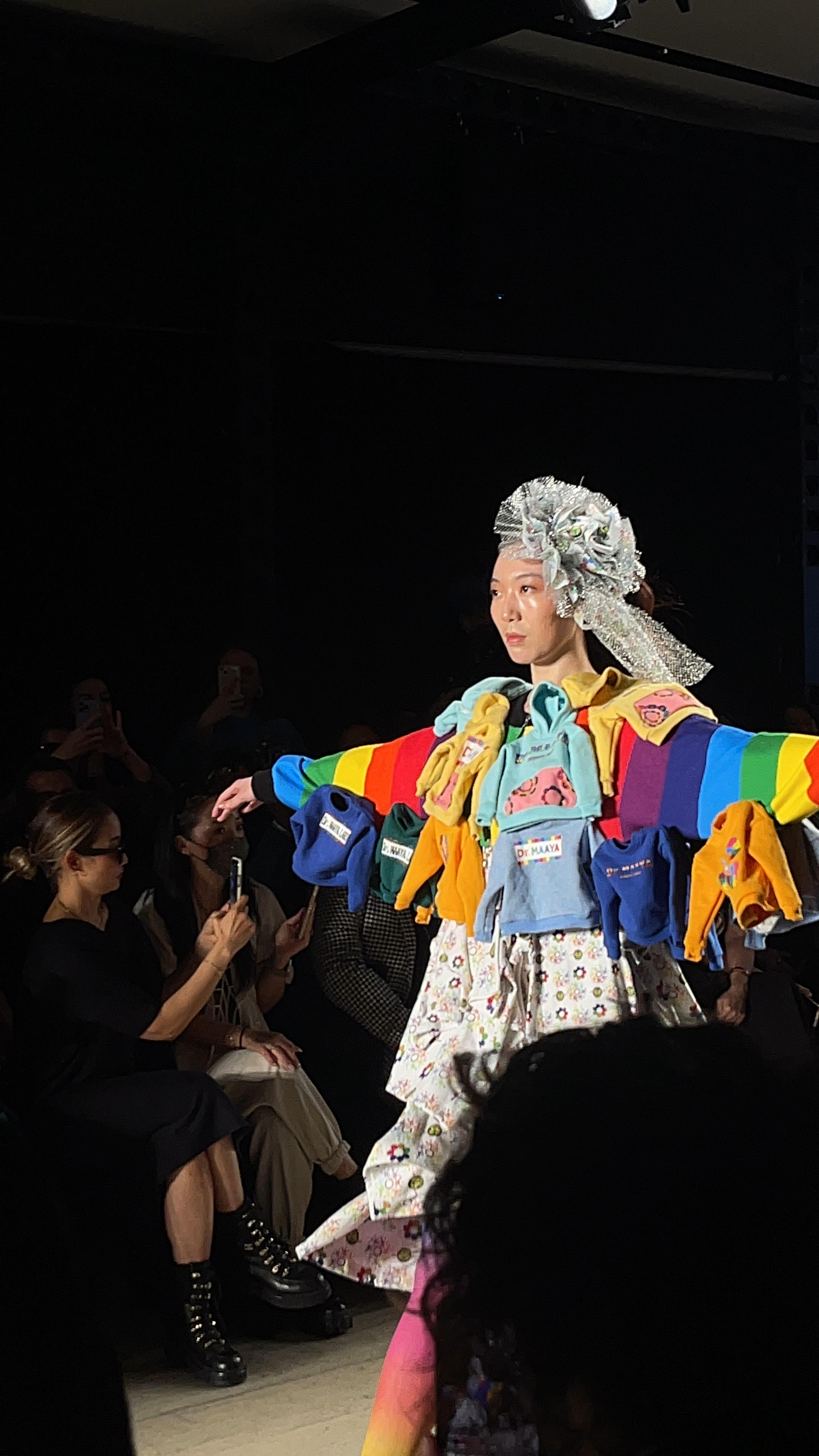 The next designer was Dr. Maaya from Japan. This collection was very different from the previous designer because this was colorful and youthful. She curated these creative designs with smaller pieces of clothing on them. In the photos displayed, you can see an example such as one dress which was blue with childlike hoodies on it. It creating a wing sleeve. She had such a fun and engaging show. It was definitely one where I personally couldn’t see myself wearing these outfits, but I very much enjoyed still enjoyed this show and all the hard work put into the pieces.