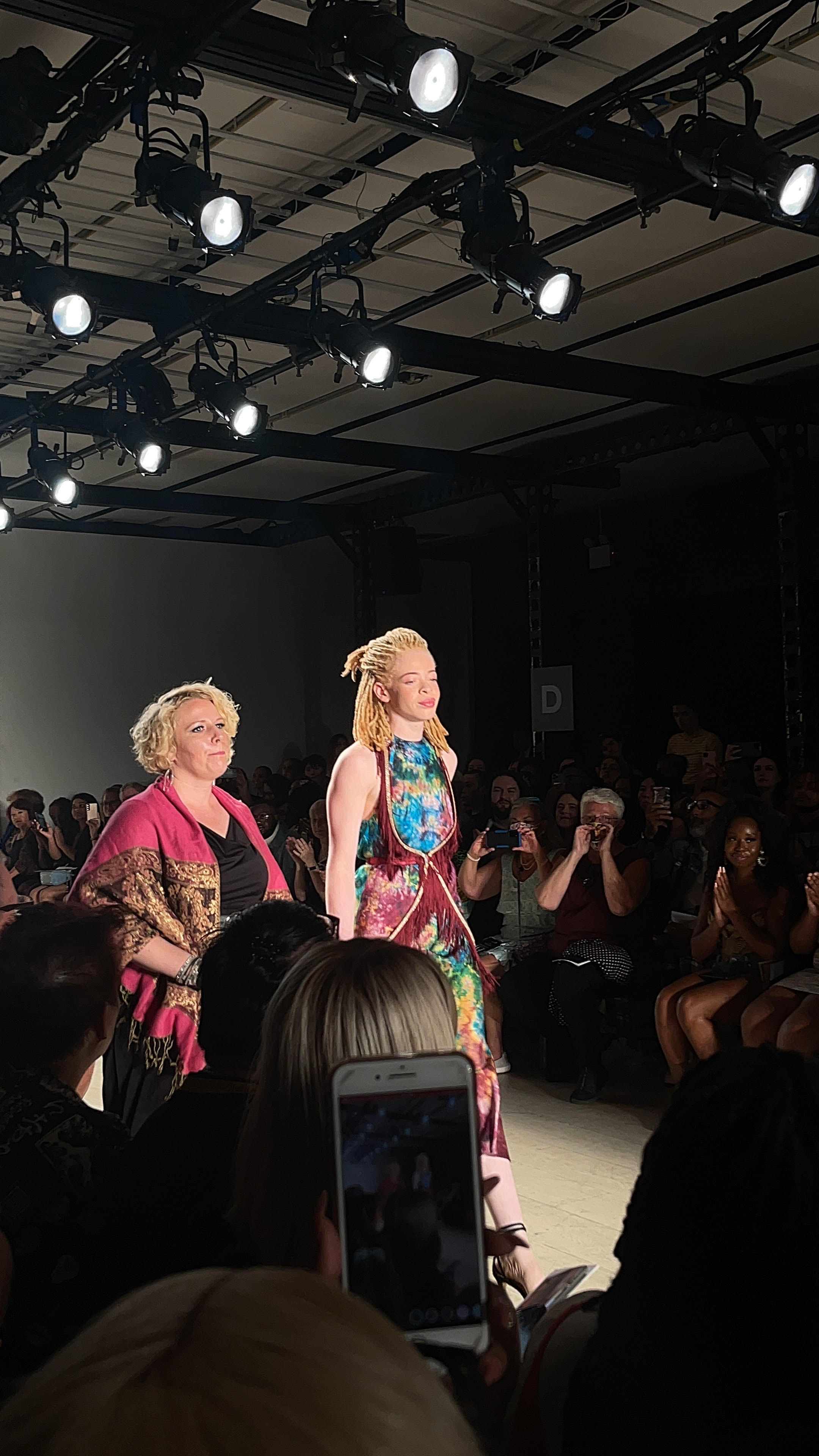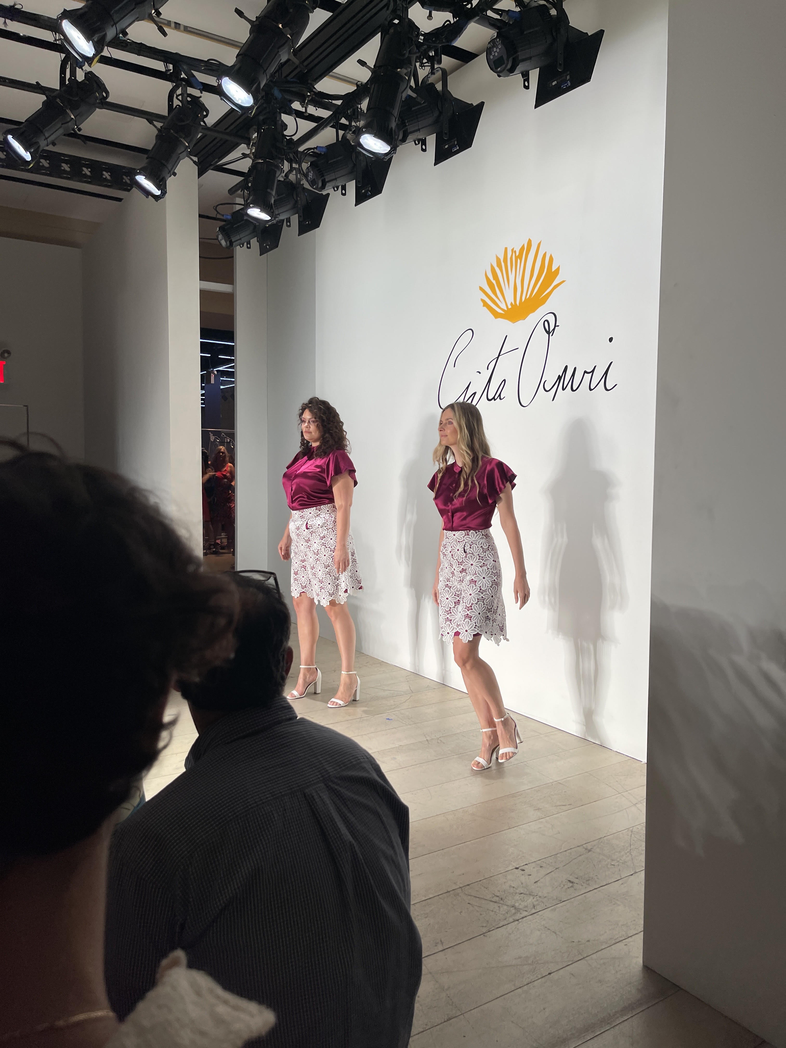 Gita Omri is a designer based in New York who is all about producing beautiful clothes that are size inclusive for women. This show was the most inclusive show I attended. Every outfit displayed had two models, one showcasing the outfit in standard sizes and the other model in a more inclusive plus size. This is such an important breakthrough in the industry. No other show had this much inclusivity, let alone two models per outfit. She had everything from tops to dresses to trousers to zip-up bomber jackets for each model.